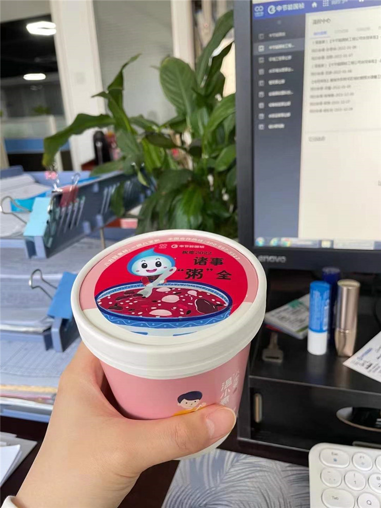 陜西彬縣由于疫情防控需要,當(dāng)?shù)刂挥袔准也惋嬮T(mén)店?duì)I業(yè),無(wú)法訂到現(xiàn)煮熱粥。彬縣國(guó)禎行政人員為了讓廠區(qū)職工喝上應(yīng)季的“臘八粥”,克服重重困難于1月9日23點(diǎn)采購(gòu)到聽(tīng)裝八寶粥。